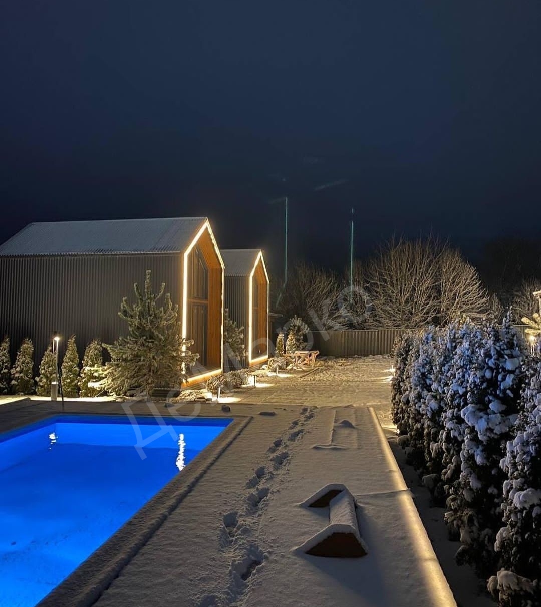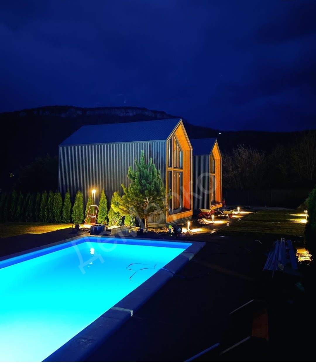 Чаша выполнена из несъёмной опалубки, что позволило добиться высокой прочности и долговечности конструкции. Отдельная детская зона глубиной, адаптированной для безопасного купания, стала ключевым элементом проекта. Система автоматической дезинфекции и долива воды обеспечивает стабильную работу бассейна без постоянного контроля.
