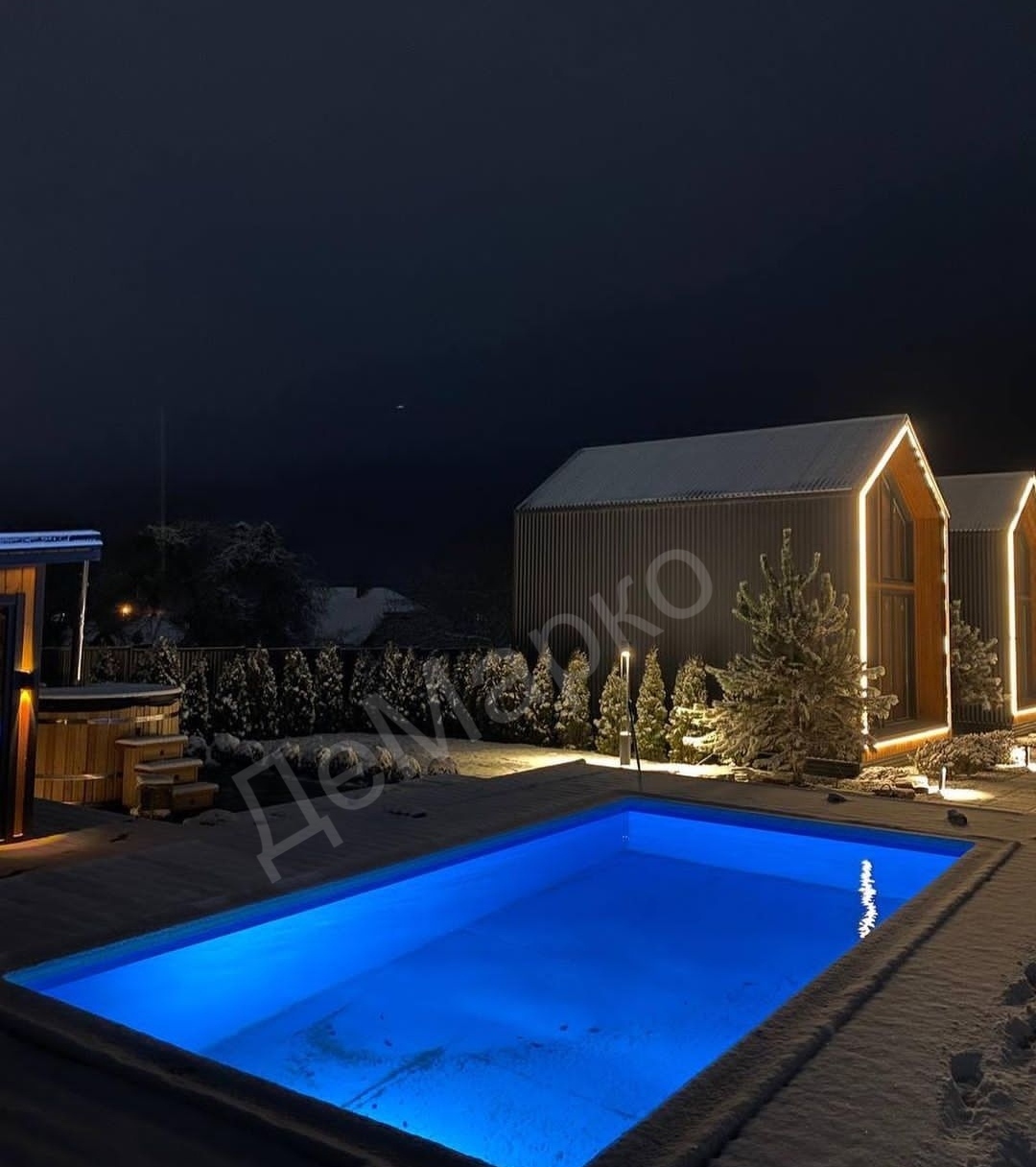 • Бетонная чаша 6×3 м (несъёмная опалубка) • Отделка ПВХ-плёнкой синего цвета • Тепловой насос для подогрева воды • Автоматическая станция дозирования химических реагентов • LED-подсветка белая • Монтаж и пусконаладка оборудования