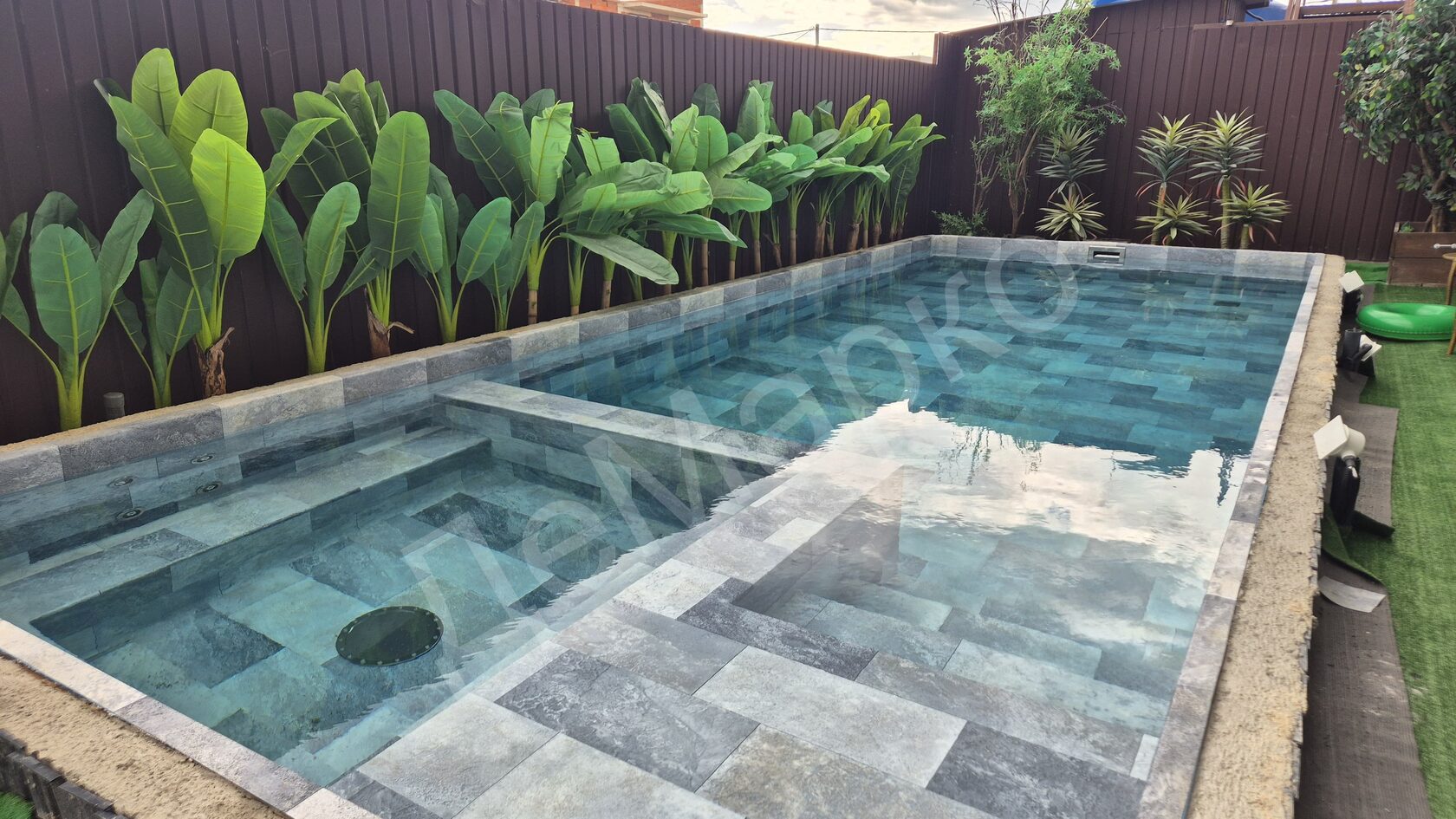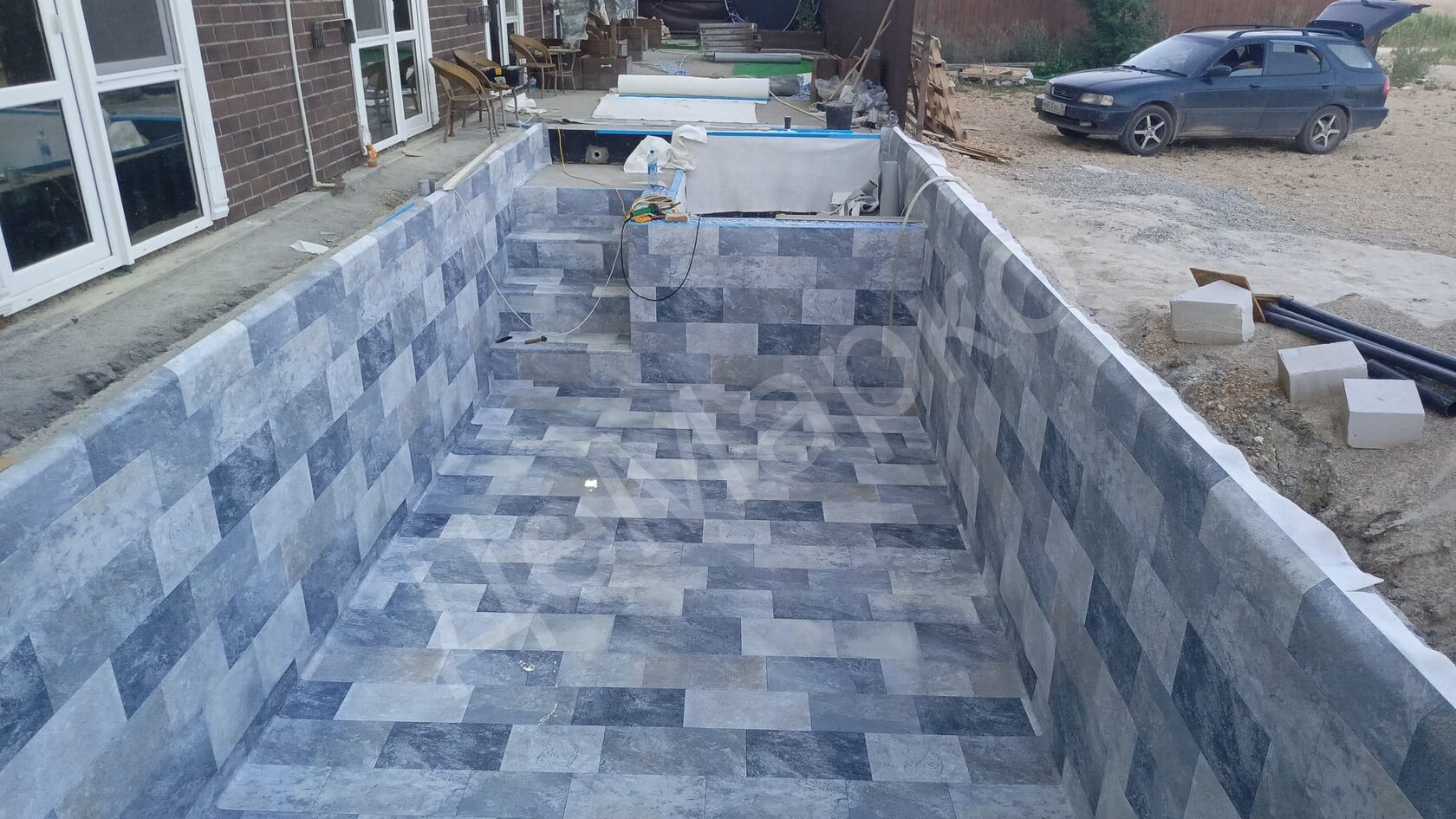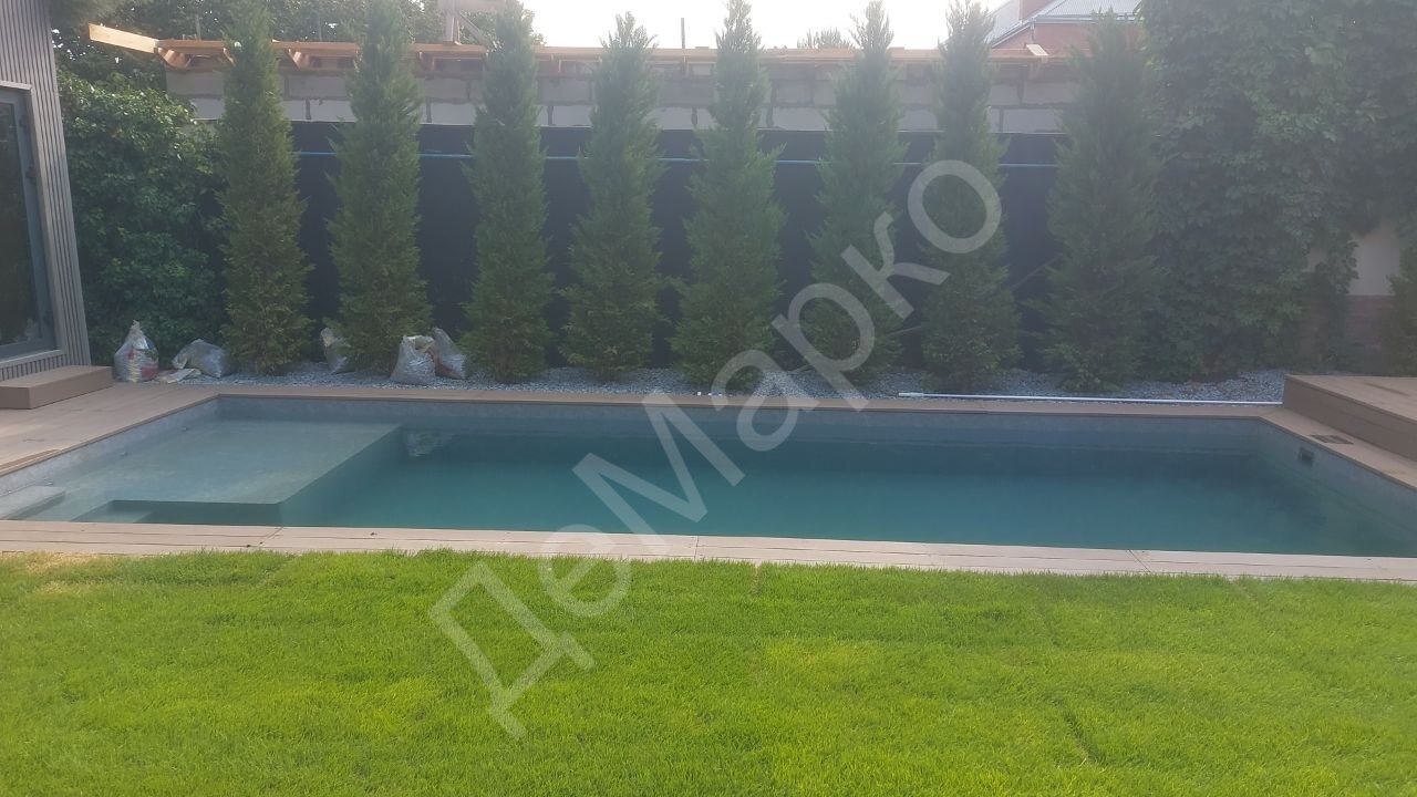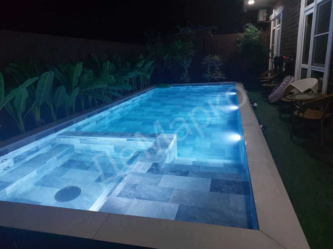 — Бетонная чаша 8×3 из несъёмной опалубки — ПВХ-мембрана под керамогранит — Автоматическая доливка воды — Автоматическая промывка фильтра — Станция автоматической дозации реагентов — Тепловой насос — Гидромассаж — Аэромассаж — Цветная LED-подсветка — Оборудование и закладные элементы из нержавеющей стали