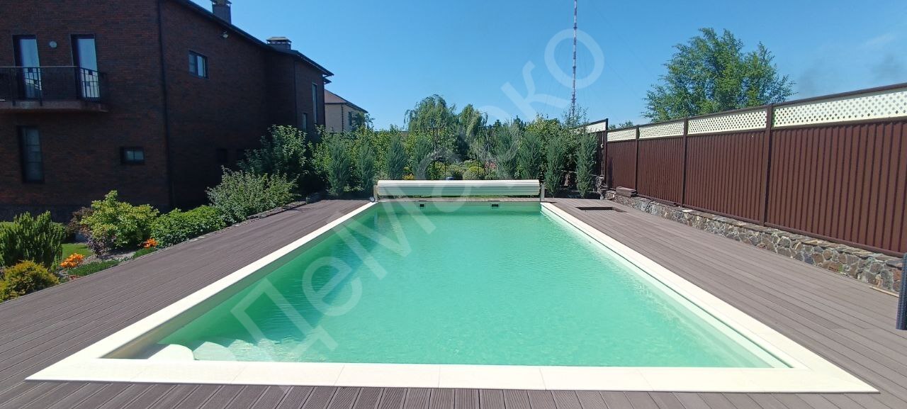 Частный дом. Бетонный бассейн 10×5 с автоматическим жалюзийным покрытием.