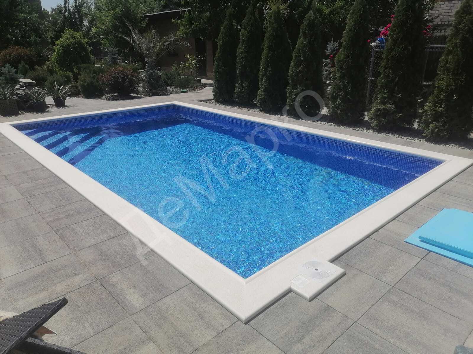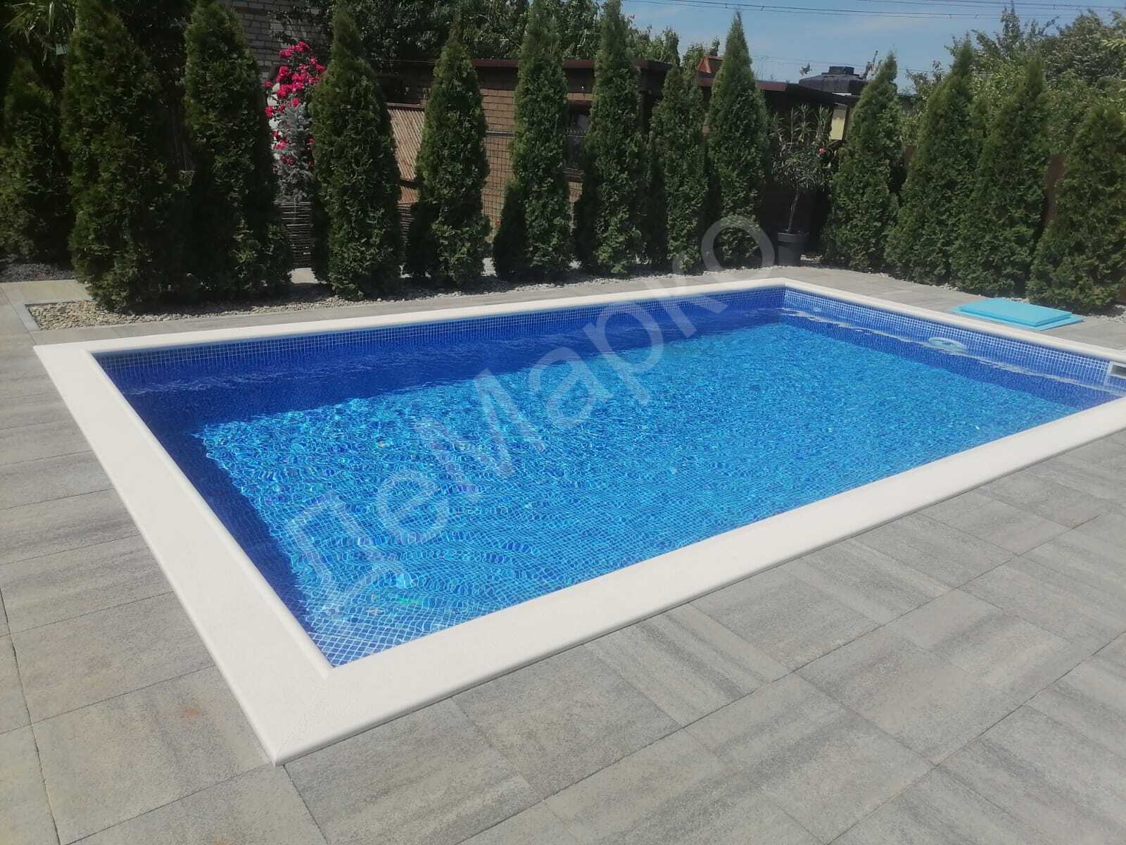 Комплектация проекта: — Бетонная чаша из несъёмной опалубки — Угловые полукруглые ступени — ПВХ-мембрана песочного оттенка — Отделка бортовым камнем — Автоматический долив воды — Автоматическая промывка фильтра — Безхлорная система автоматической дезинфекции — Оборудование и закладные элементы из нержавеющей стали — Автоматическое жалюзийное покрытие