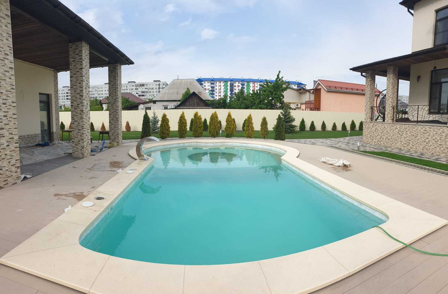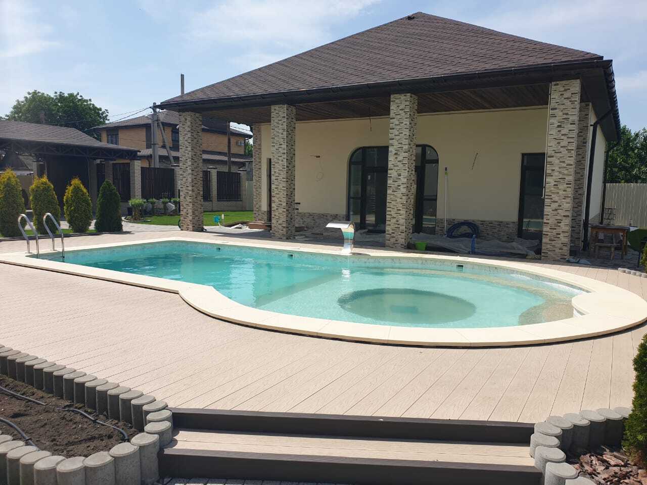 Просторный бассейн сложной формы стал центральным элементом зоны отдыха частного дома. Проект объединяет эстетику, комфорт и функциональность — здесь одинаково приятно плавать, отдыхать и принимать гостей. Благодаря продуманной инженерии и качественным материалам бассейн выглядит эффектно и при этом остаётся удобным в ежедневной эксплуатации.